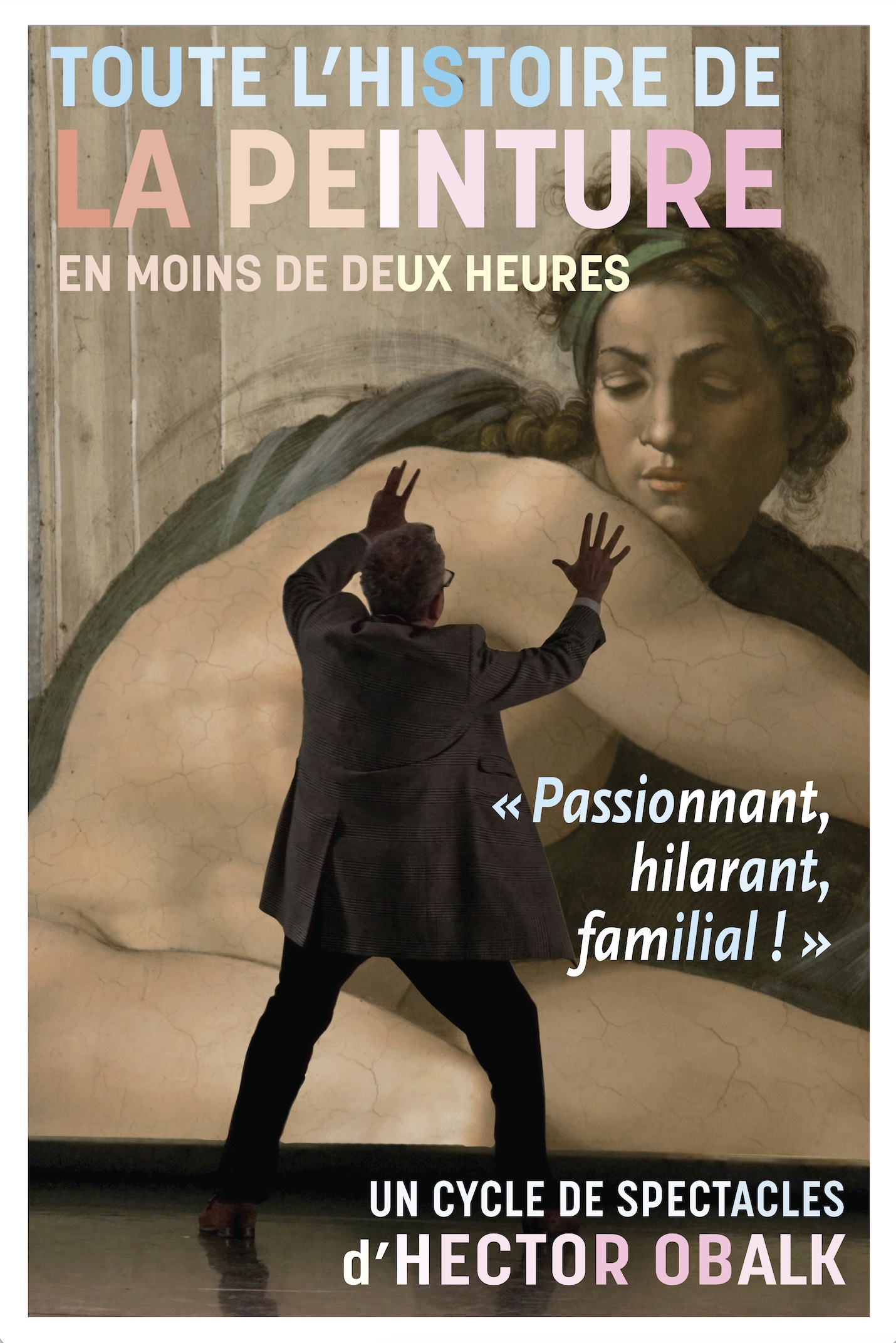 Hector Obalk fait un stand’up en musique et en images sur l’histoire de la peinture occidentale, accompagné de ses musiciens et d’un écran géant projetant des détails époustouflants. Spectacle complet, visuellement sophistiqué, musical et drôlissime d’un expert original, passionné et pédagogue. Pour tout public, de 9 à 99 ans. Sur la trame d’un mur de 1000 images, chaque show propose de visiter toute l’Histoire de la peinture, de Giotto à Yves Klein, et au-delà…